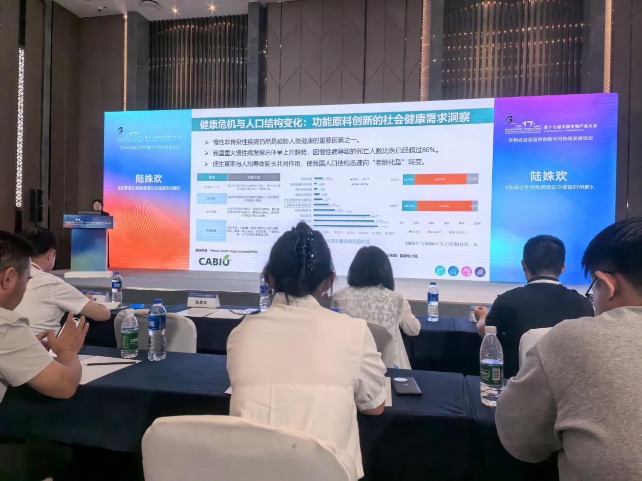 嘉必優(yōu)生物技術(shù)(武漢)股份有限公司研發(fā)總監(jiān)陸姝歡博士在生物合成食品的創(chuàng)新與可持續(xù)發(fā)展論壇以《多模態(tài)生物數(shù)據(jù)驅(qū)動功能原料創(chuàng)新》為主題做出精彩匯報。本次主題演講聚焦“數(shù)據(jù)驅(qū)動”與“功能原料創(chuàng)新”的深度融合,系統(tǒng)闡釋了多模態(tài)生物數(shù)據(jù)在打破傳統(tǒng)研發(fā)壁壘中的核心價值。報告指出,通過整合基因組學(xué)、代謝組學(xué)等多維度生物數(shù)據(jù),能夠精準解碼原料的功效機制與作用靶點,為功能原料的篩選、優(yōu)化及產(chǎn)業(yè)化提供了全新的科學(xué)路徑。這一思路不僅推動功能原料研發(fā)從“經(jīng)驗驅(qū)動”向“數(shù)據(jù)驅(qū)動”轉(zhuǎn)型,更有望加速兼具高活性、高安全性與高適用性的創(chuàng)新原料落地,為大健康、美妝等相關(guān)產(chǎn)業(yè)的高質(zhì)量發(fā)展注入新動能,引發(fā)與會專家強烈共鳴。